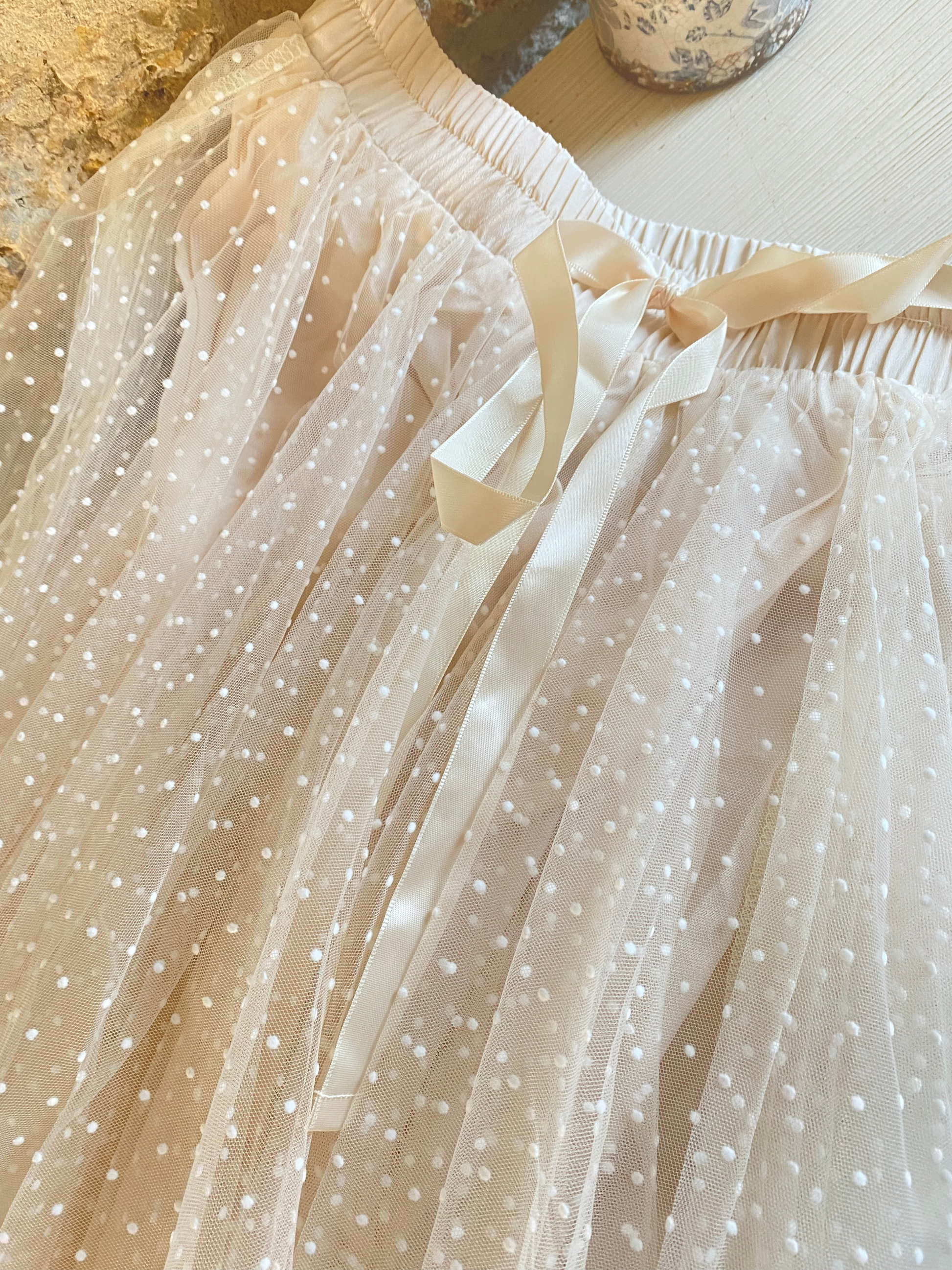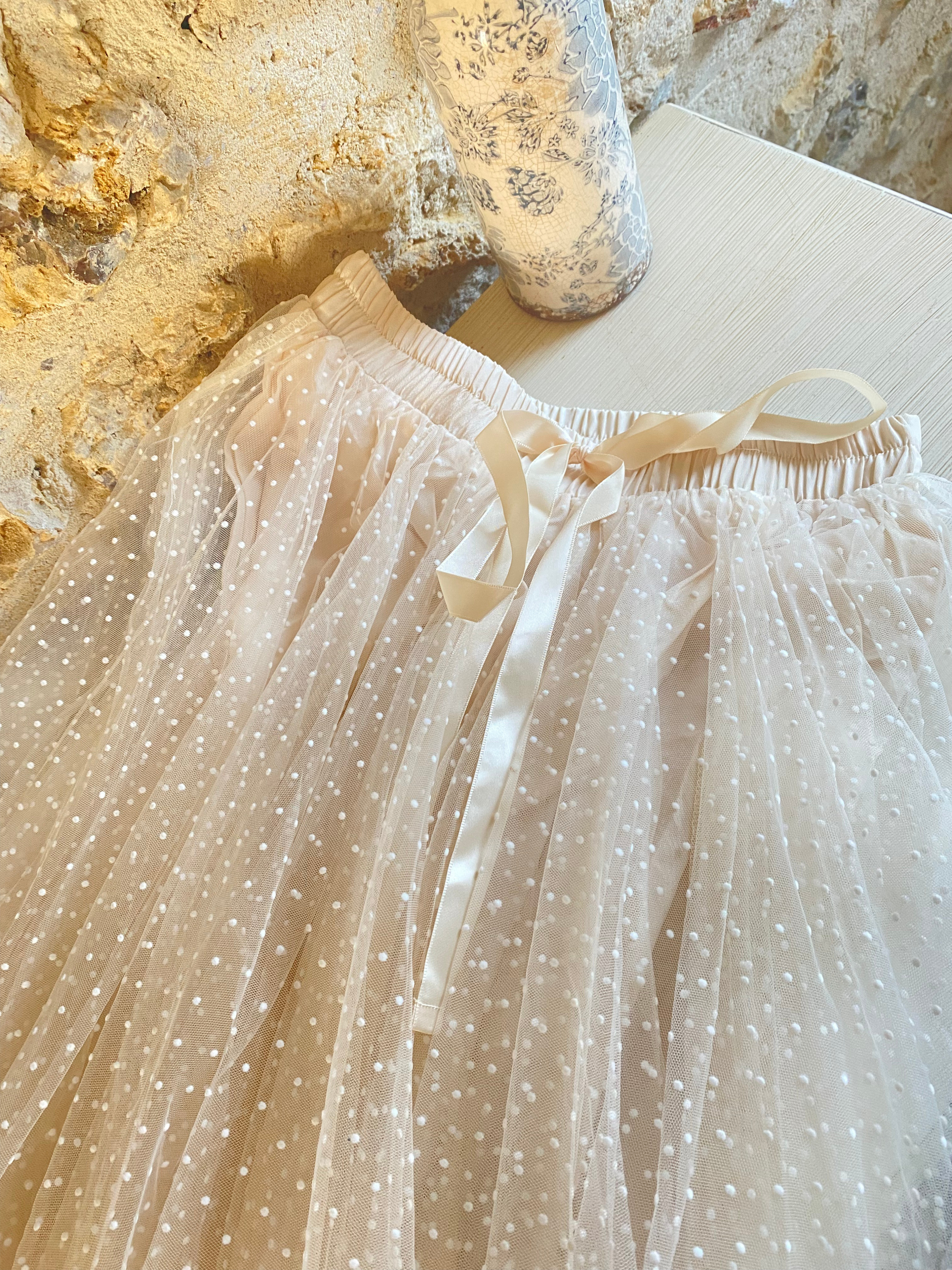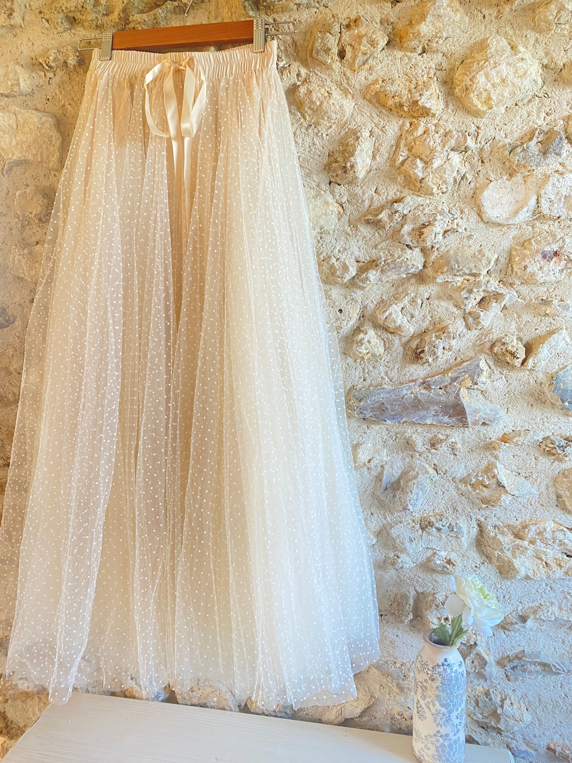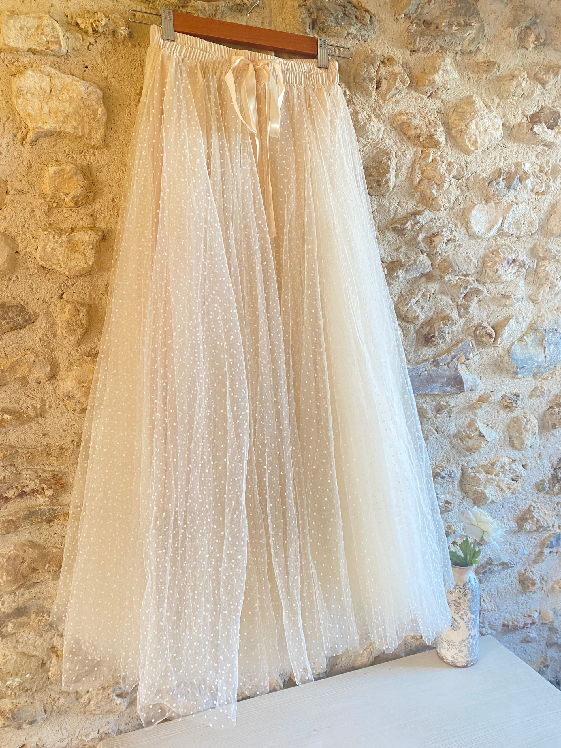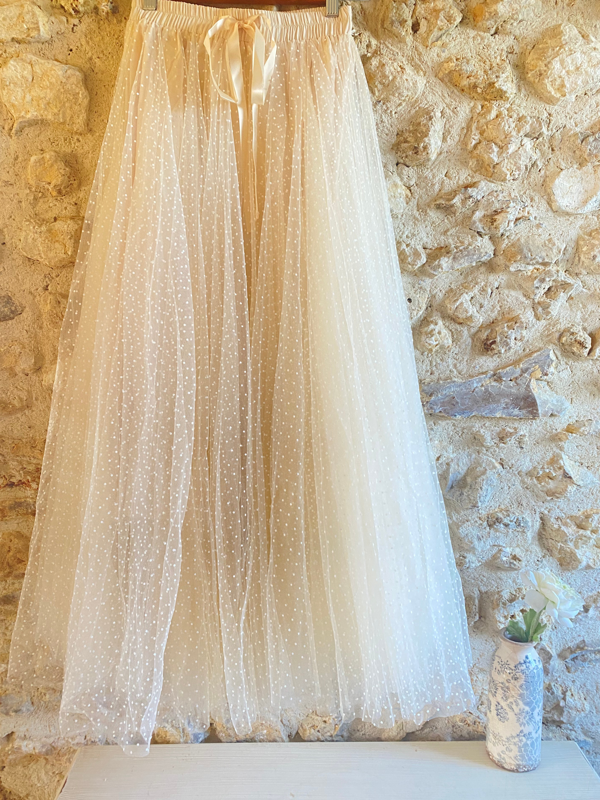 Jupe longue en tulle plumetis écru avec une fine bande élastique à la taille.