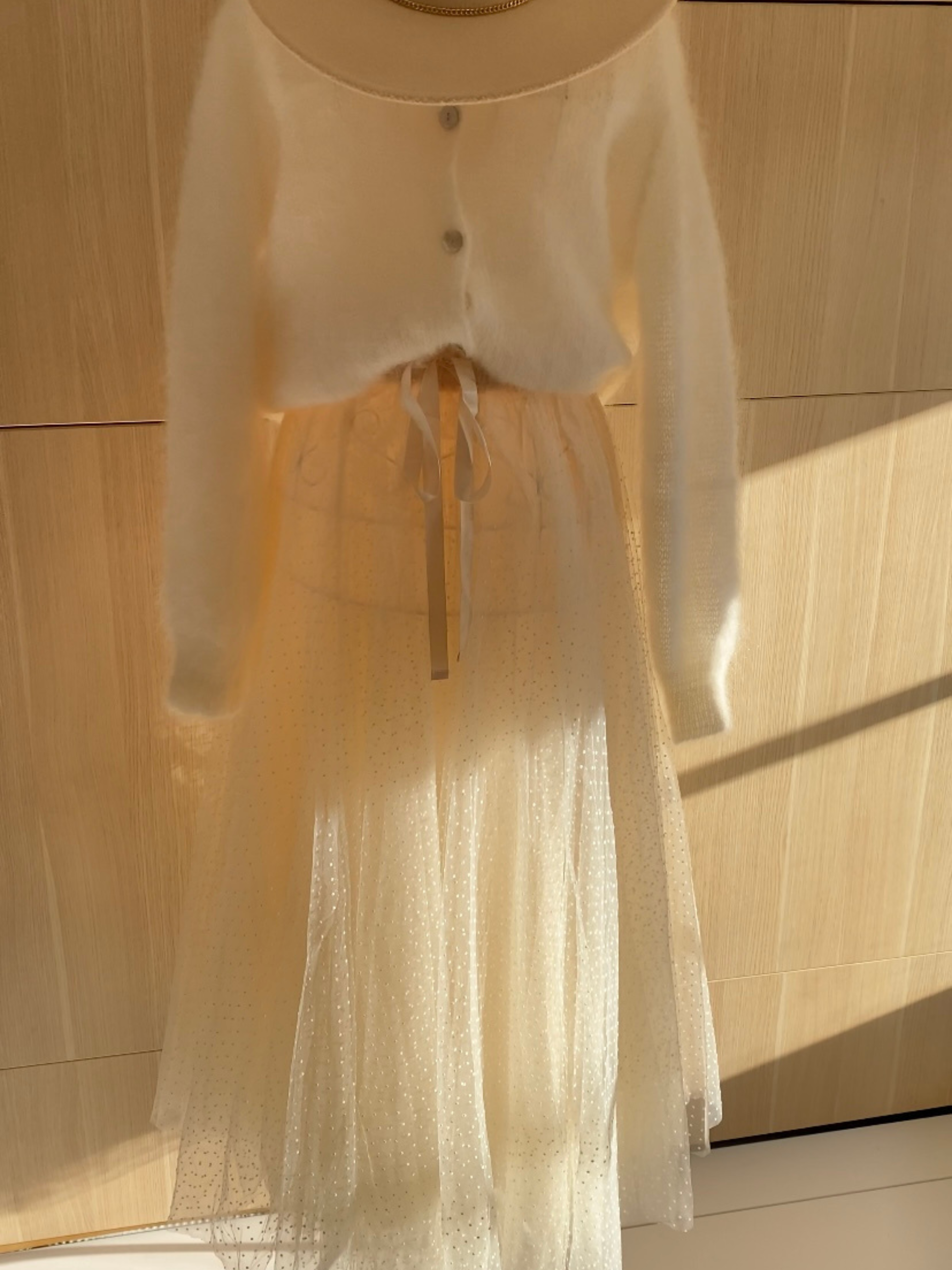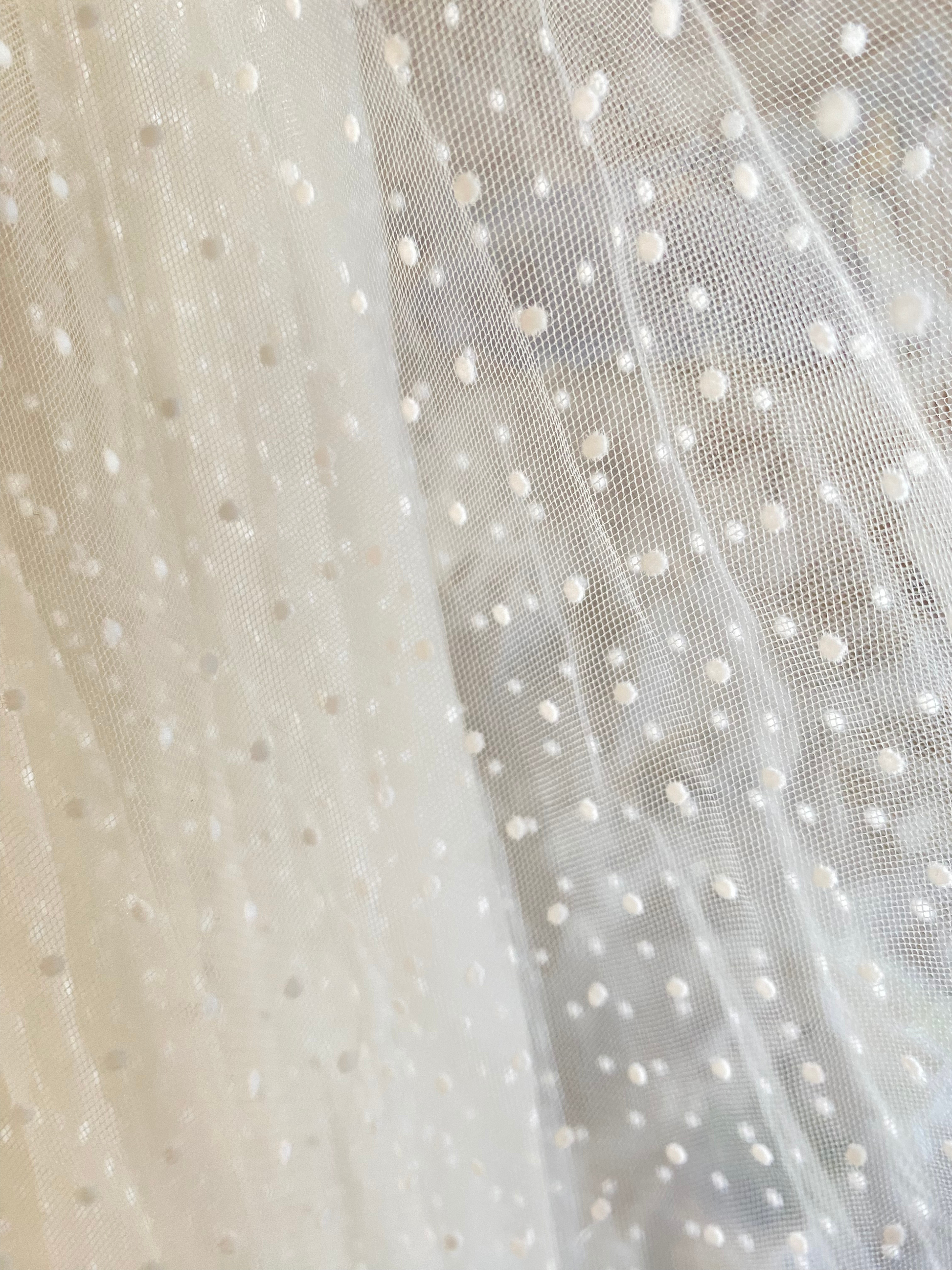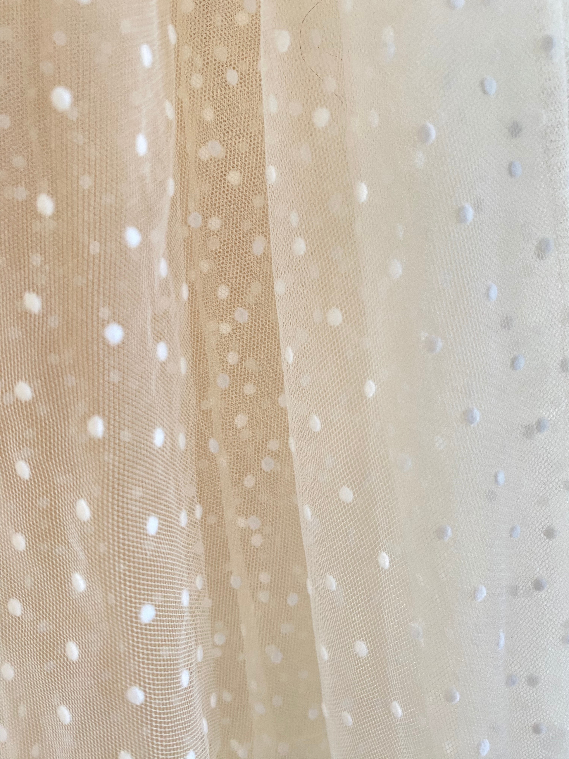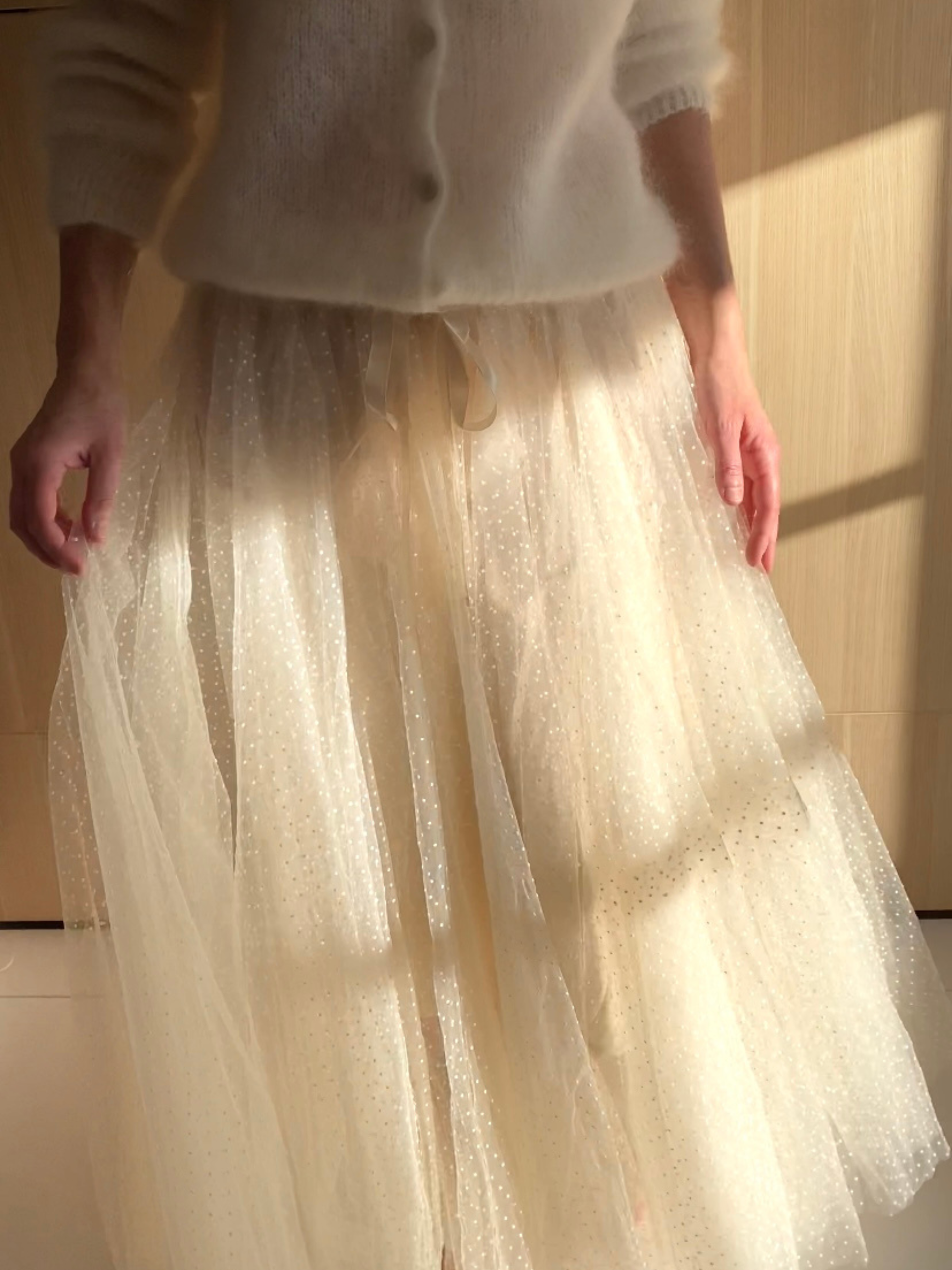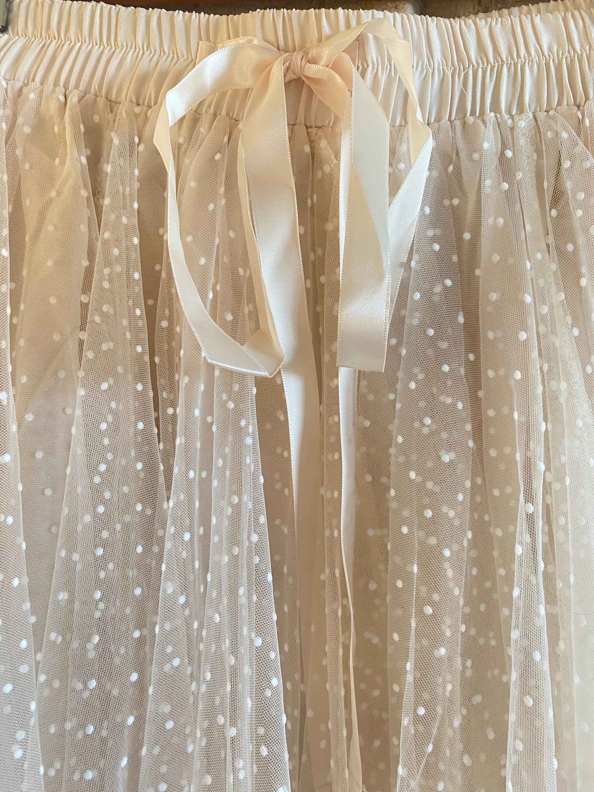 Jupe longue en tulle plumetis écru avec une fine bande élastique à la taille.