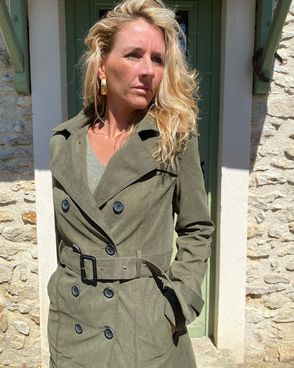 - Trench Coat Court Kaki , ceinture à la taille, deux poches à l'avant